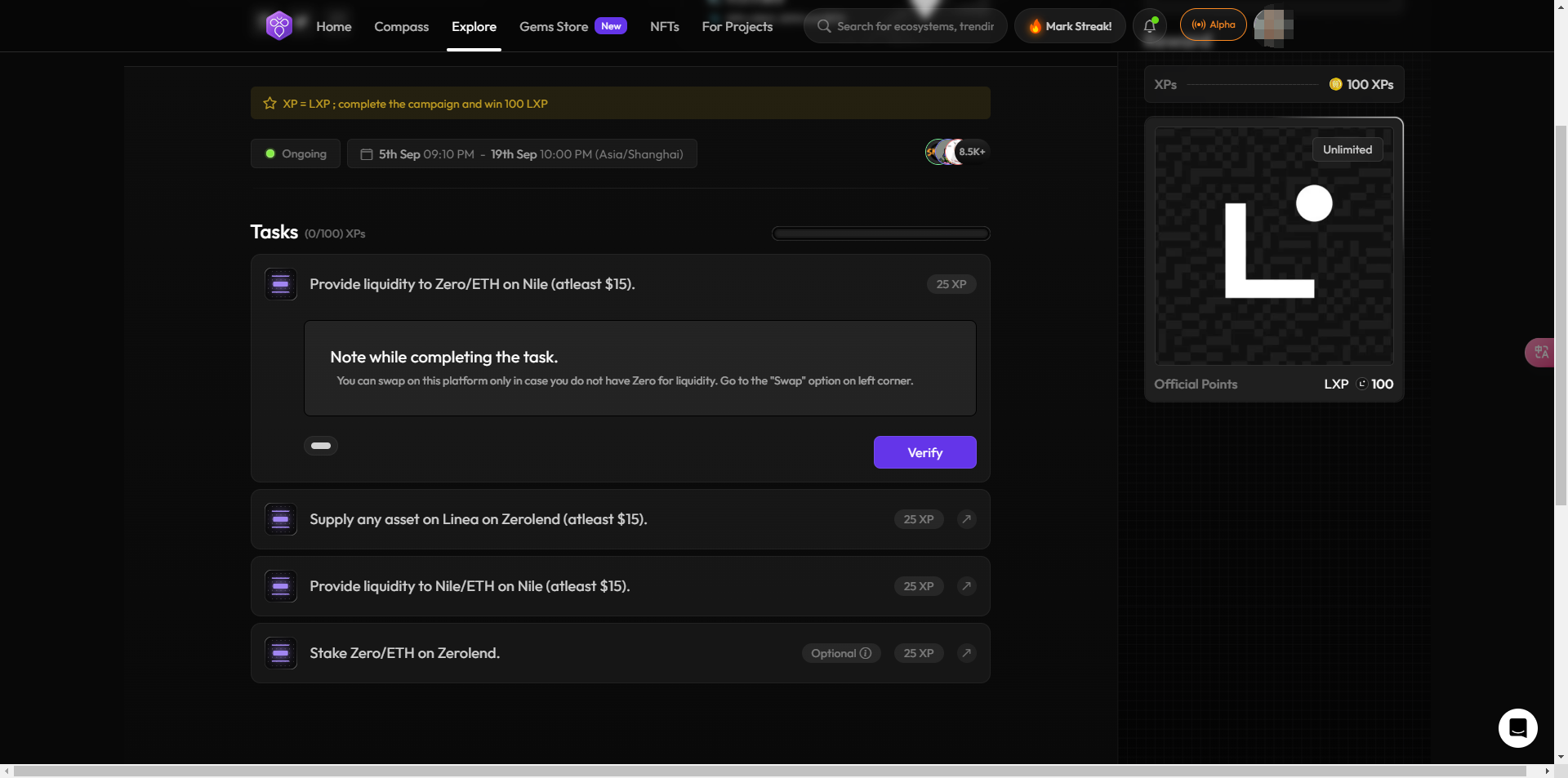 首先进入任务网站,我们钱包中Linea链上必须得有50u以上的以太