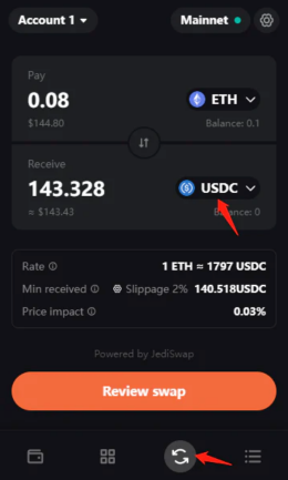 在Starknet钱包Argent X上自带的SWAP中进行ETH-USDC兑换